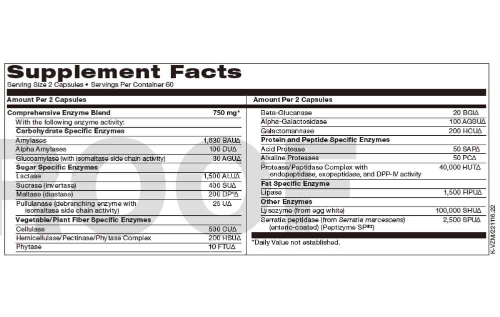 · Supplies a broad spectrum of disaccharidases (lactase, maltase, sucrase/invertase, pullulanase, and isomaltase) to assist in cleaving of sugars that may be fermented by organisms that shift the balance of microbiota†